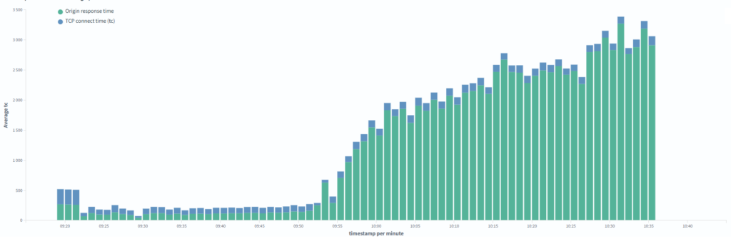 Na druhou stranu, web vlivem útoku začal postupně zpomalovat a to tak, že to už bylo znatelné. Na grafu vidíte délku spojení na origin server a dobu odpovědi.
